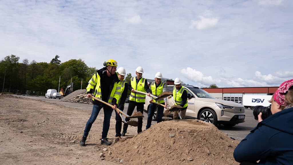 Den 8 maj 2025 togs det första spadtaget för vår nya Volvo-anläggning på Helsingborgsvägen 14 i Hässleholm. Bygget är nu i full gång – redan måndagen den 12 maj börjar plintarna att sättas på plats.