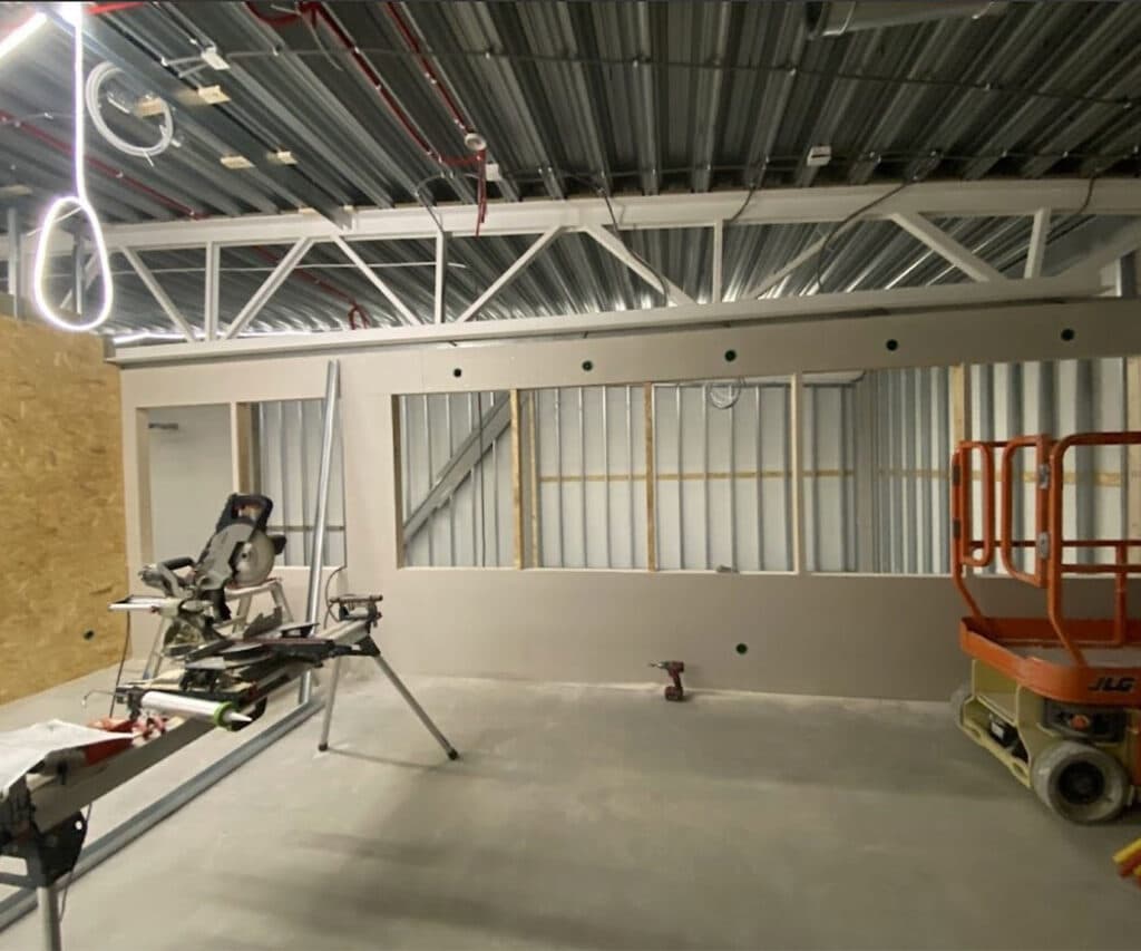 Entreprenörerna rör sig målmedvetet mellan innerväggar, eldragningar och installationer. Det luktar svagt av sågspån och lim, och ljudet av spikpistoler blandas med det dova brummandet från maskinerna utanför.